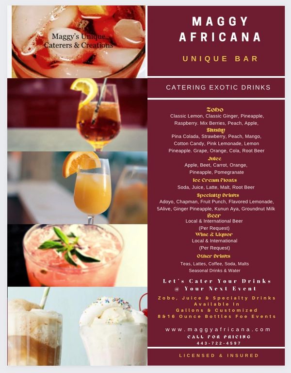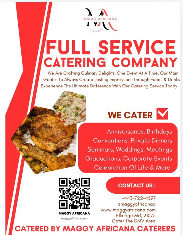 The Executive Chef Maggy, started Maggy Africana LLC DBA Maggy Africana Caterers in 2008, with a vision of offering Maryland's finest catering experience. Great taste and clean presentation is the name of the game and we're committed to stepping up to the plate. Our goal is to provide delicious, natural options. That's why we prepare all of our meals with fresh, locally sourced ingredients.