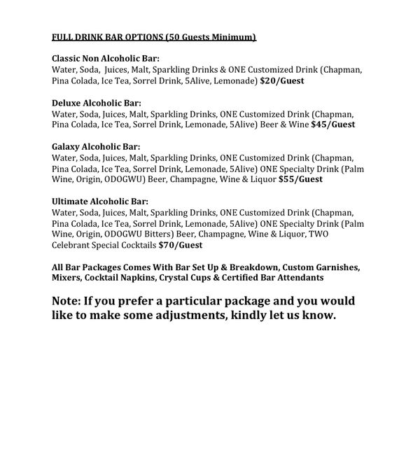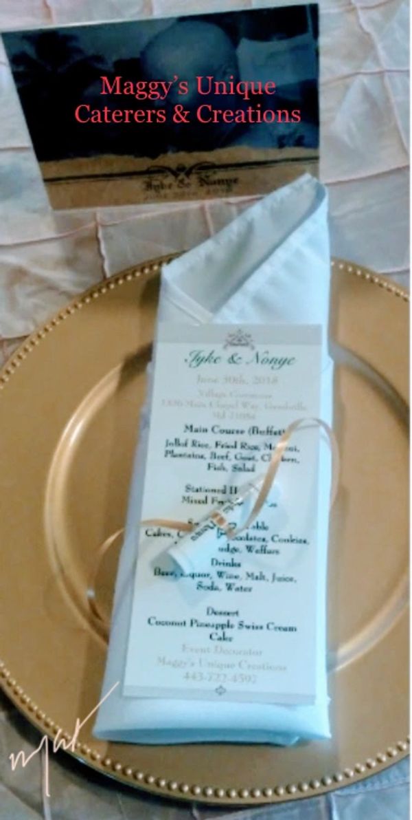 Some of the events were held at reputable event centers, The WILLARD Hotel DC "We Catered The 5th Nigerian Wedding, Since The 1800, The Botanic Gardens MD, The Annapolis Maritime Museum, Camelot By Martin's, Martin's West, The Sheraton, The Marriott, Samuel Riggs, Ten Oaks Ballroom and many other beautiful event centers..